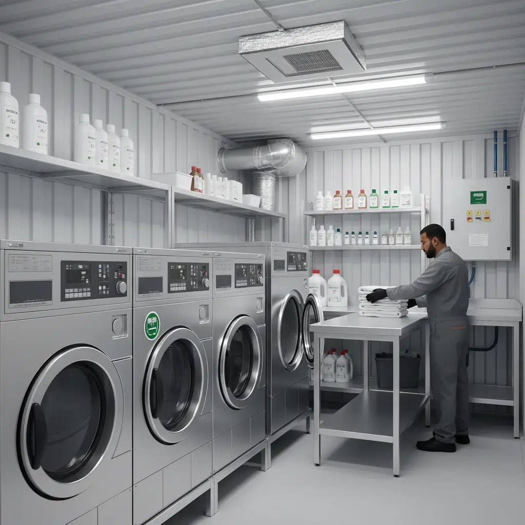 Saudi Elan supplies Container Laundry Units that are fully equipped for efficient mobile laundry solutions. These units offer flexibility and high performance for on-site laundry needs.